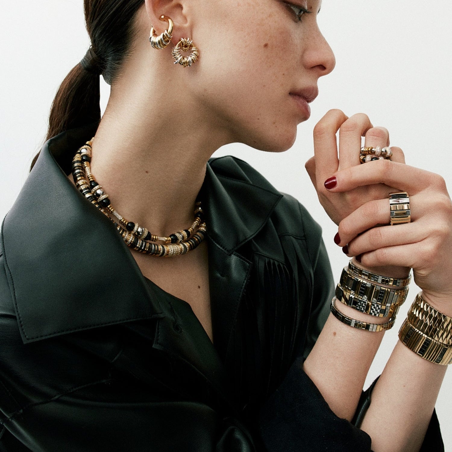 Décliné en plusieurs tailles et designs, il peut être porté seul, pour une élégance minimaliste, ou en accumulation, jouant sur les contrastes et les associations audacieuses.