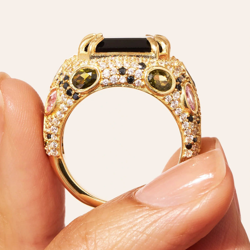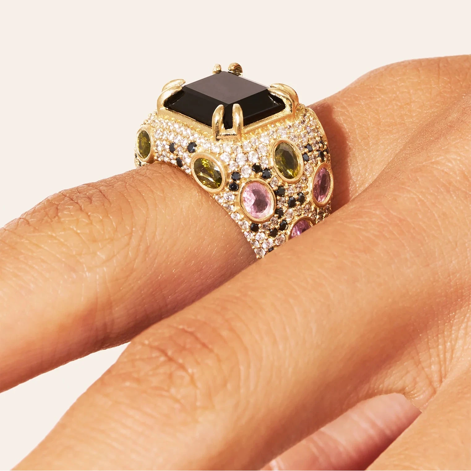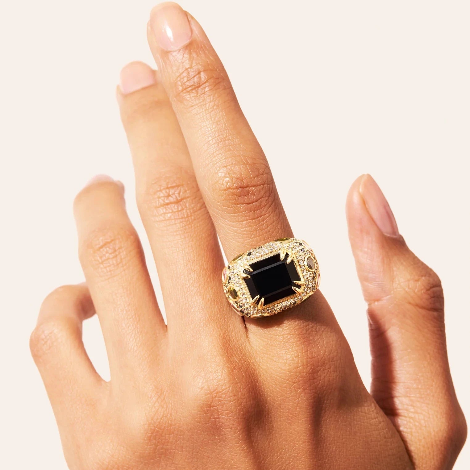 Sublime et audacieuse, cette bague BE MAAD se distingue par son design sculptural et son allure luxueuse. Conçue en vermeil doré, elle met en valeur une pierre centrale rectangulaire de couleur noire, taillée avec précision pour capter la lumière sous tous les angles.