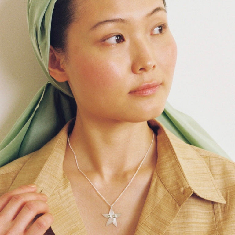 Le pendentif représente un astre, l'étoile qui illumine et brille, avec deux petits yeux en pierres topazes (verte pâle translucide) !