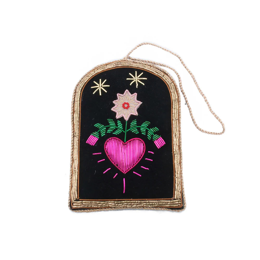 Cœur et fleur sur cadre velours noir, canetille. Amour vivant « un symbole d’amour et de passion lumineuse ». Inspirées de symboles et de figures protectrices, ces décorations sont pensées comme de petits talismans à suspendre au mur, à une poignée, au sapin lors des fêtes ou simplement à intégrer dans votre décoration quotidienne, elles insufflent une touche de charme et de fantaisie à vos espaces.